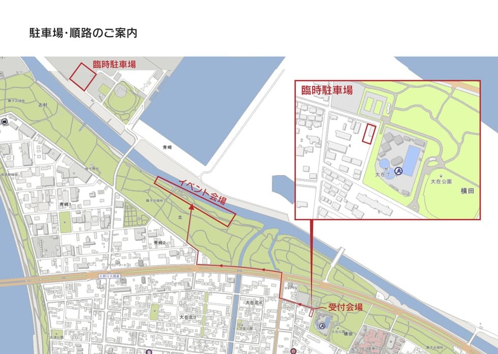 大在公園から30分程度、徒歩で散策しながら会場に向かいます。
